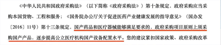 《國務(wù)院辦公廳關(guān)于促進(jìn)醫(yī)藥產(chǎn)業(yè)健康發(fā)展的指導(dǎo)意見》中規(guī)定,國產(chǎn)藥品和醫(yī)療器械能夠滿足要求的,政府采購項(xiàng)目原則上須采購國產(chǎn)產(chǎn)品。